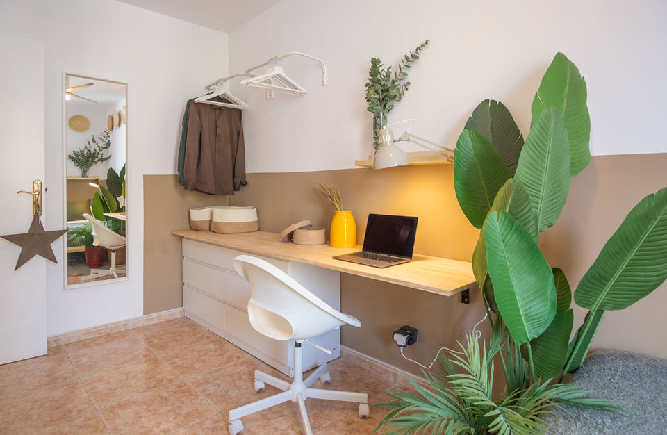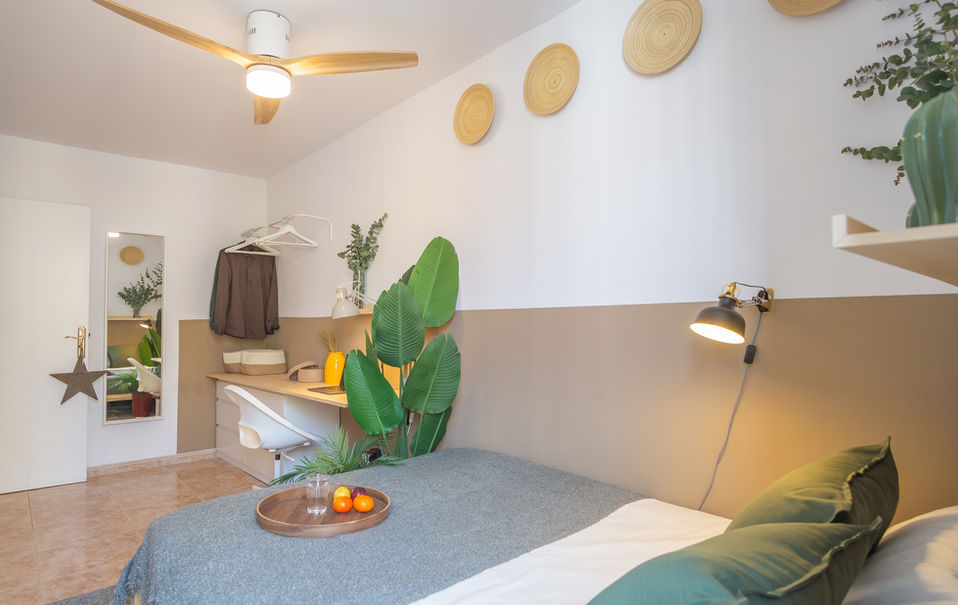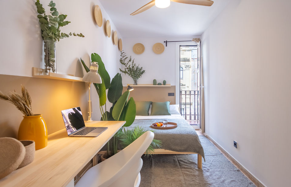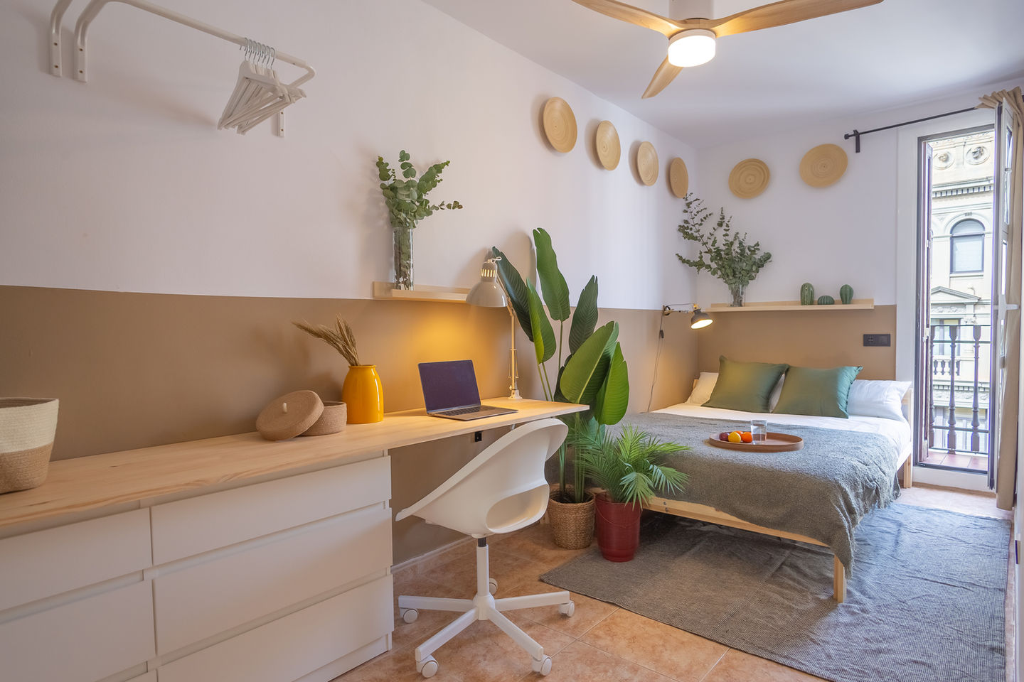 Bright double room with balcony, large desk and all the necessary equipment to make the most of your stay in Barcelona.